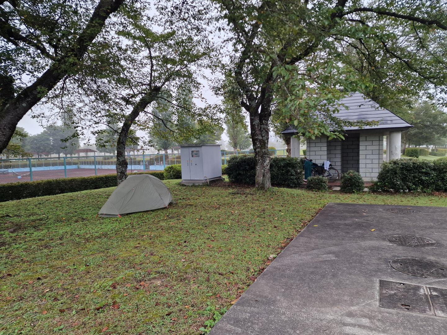 Min opprinnelige plan for overnatting var å bruke campingplassen på andre siden av veien, fordi den hadde en restaurant og onsen. Dessverre var den visst full, ikke at det så sånn ut som det, men sånn var det bare. Heldigvis var det en stor idrettspark med toaletter (dusjtoaletter!) rett ved. Så etter en liten trilletur fant jeg en fin plass under noen trær, rett ved et toalett. Så da fikk jeg utnyttet campingplassens sine faciliteter, spist middag, og badet.