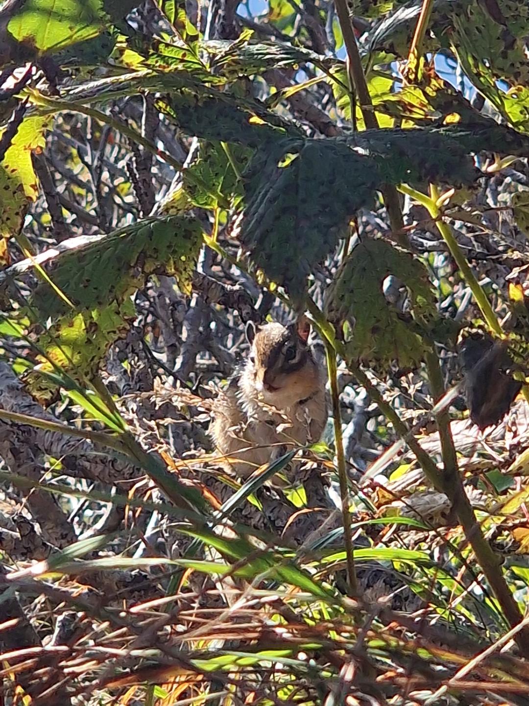 Etter vi hadde vært innom hytta bar det videre helt til toppen for å se sola gå ned. På veien opp så vi denne søte lille krabaten spise, hva jeg tror var grønne kongler. Den var ikke sky, og vi stod lenge og så på den. Var ikke så lett å ta bilde av dne godt skjult inne i buskene.