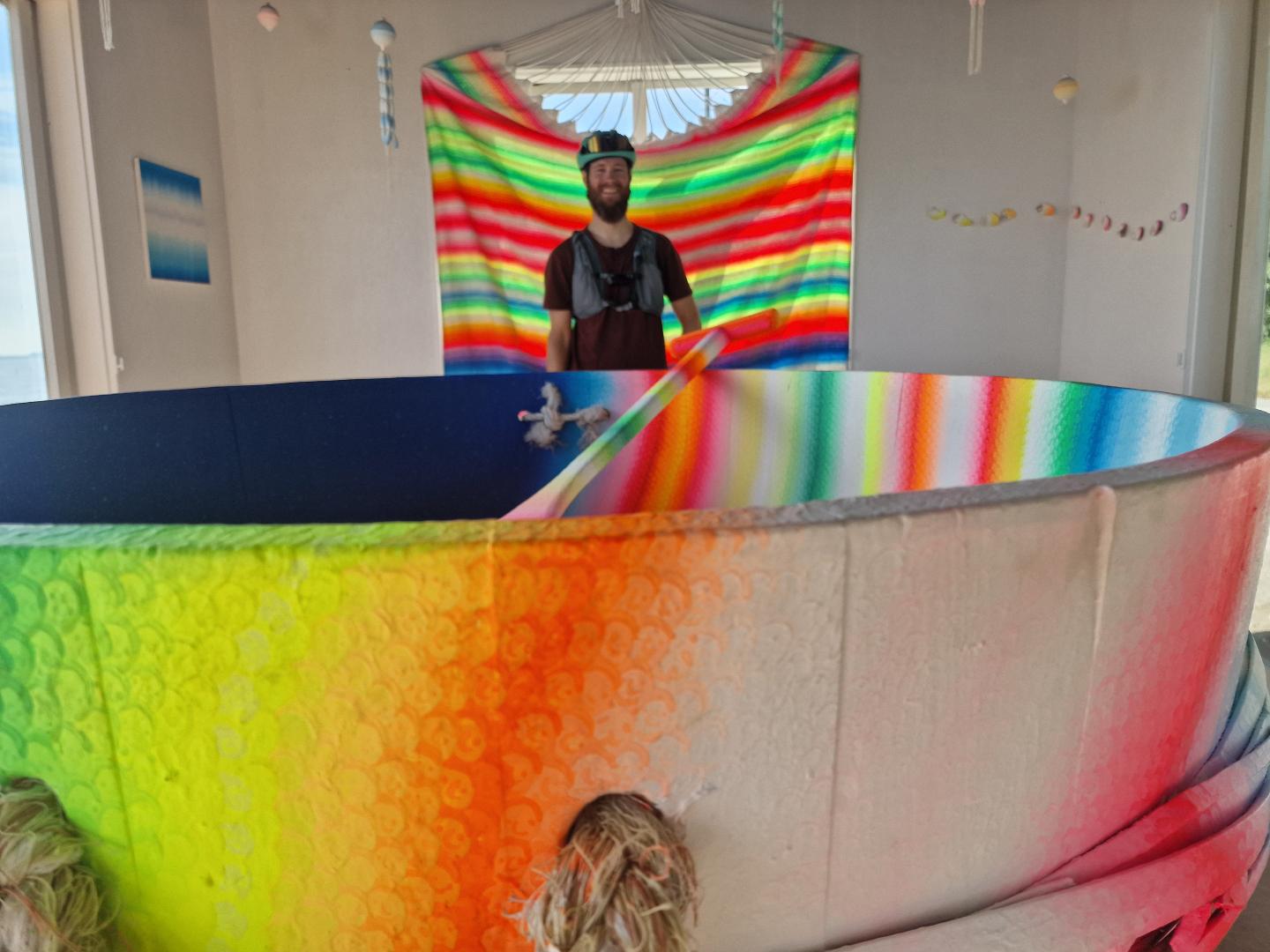 Jeg nevnte å så vidt tidligere at det var en pågående kunstfestival på øya, og på vei til lunsj syklet jeg forbi et lite galleri. Og det var veldig lite, kanskje 4x2m. I midten stod en sånn båt jeg hadde prøvd, og det hang to bilder på veggen, pluss en hengekøye. Alt var malt med et stempel av et lite ansikt. Veldig søtt!