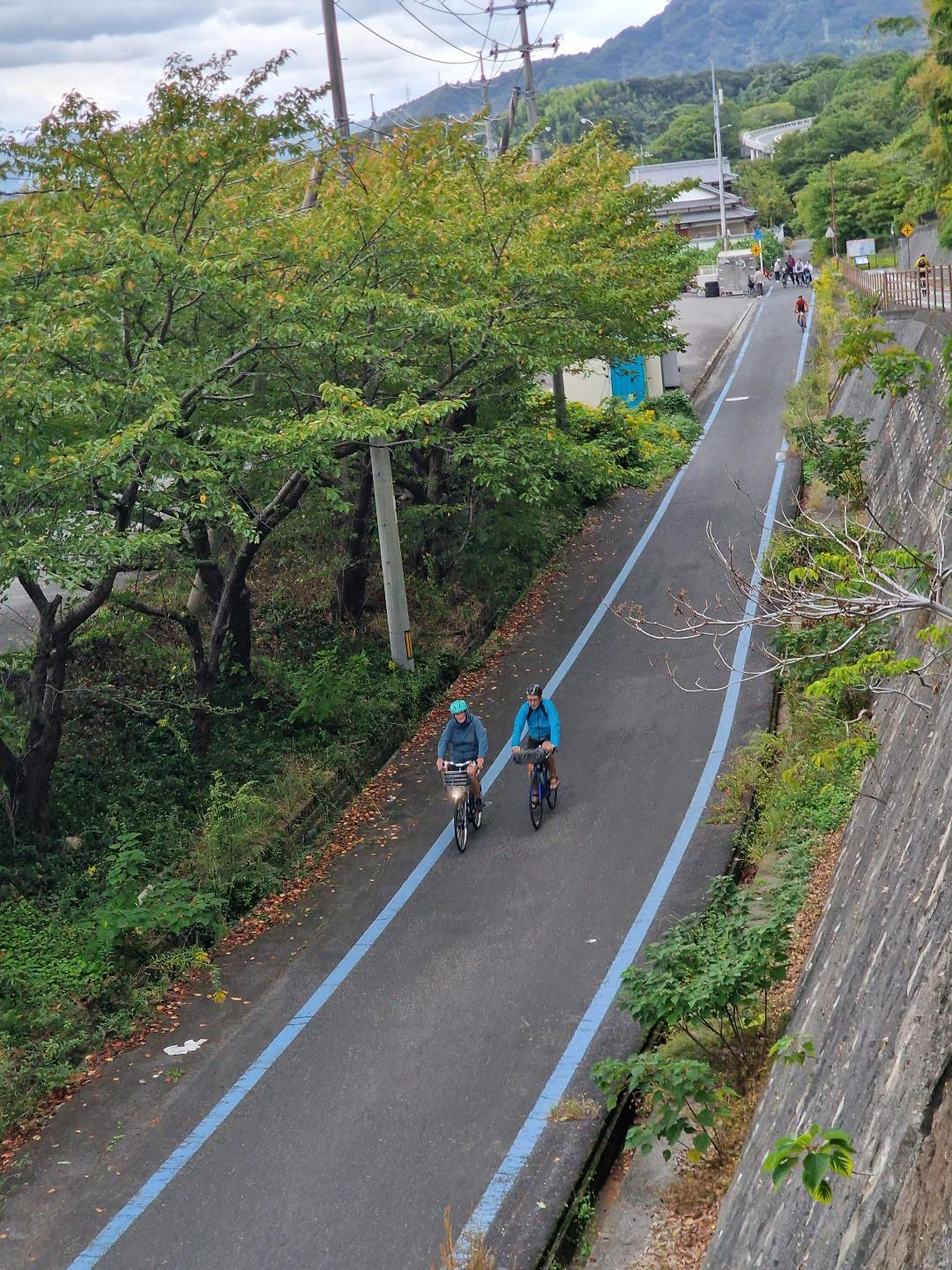 Den mest populære ruta er på 75km, men vi skal ta dette over to dager. Derfor skal vi overnatte på en tradisjonell ryokan, hvor vi sover på futon, og får tilberedt tradisjonell japansk middag og frokost. Noe som ble litt av en overraskelse for mamma og pappa. Her går man med tøfler inne, og man bytter til toalettøfler når man går på do, og det var egne tøfler når vi gikk til middagen. Det har ikke jeg vært borti før. Vi fikk også hver vår yukata til å ha på oss når vi var på ryokaen, det er veldig kjekt når man er på sykkeltur, mindre klær å ha med seg.