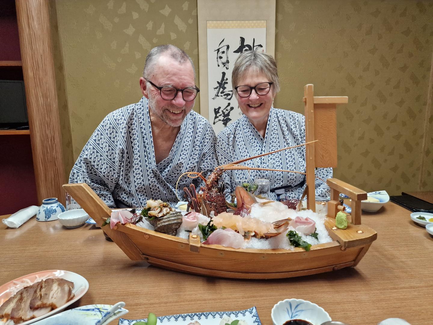 Middagen var lokal fisk, sashimi/rå, stekt, og kokt. Sashimien kom i en stilig trebåt! De som jobbet der var veldig trivelige, og flinke til å fortelle mamma og pappa hvordan man skulle spise de forskjellige rettene. Så kan virkelig anbefale Sawaki Ryokan.