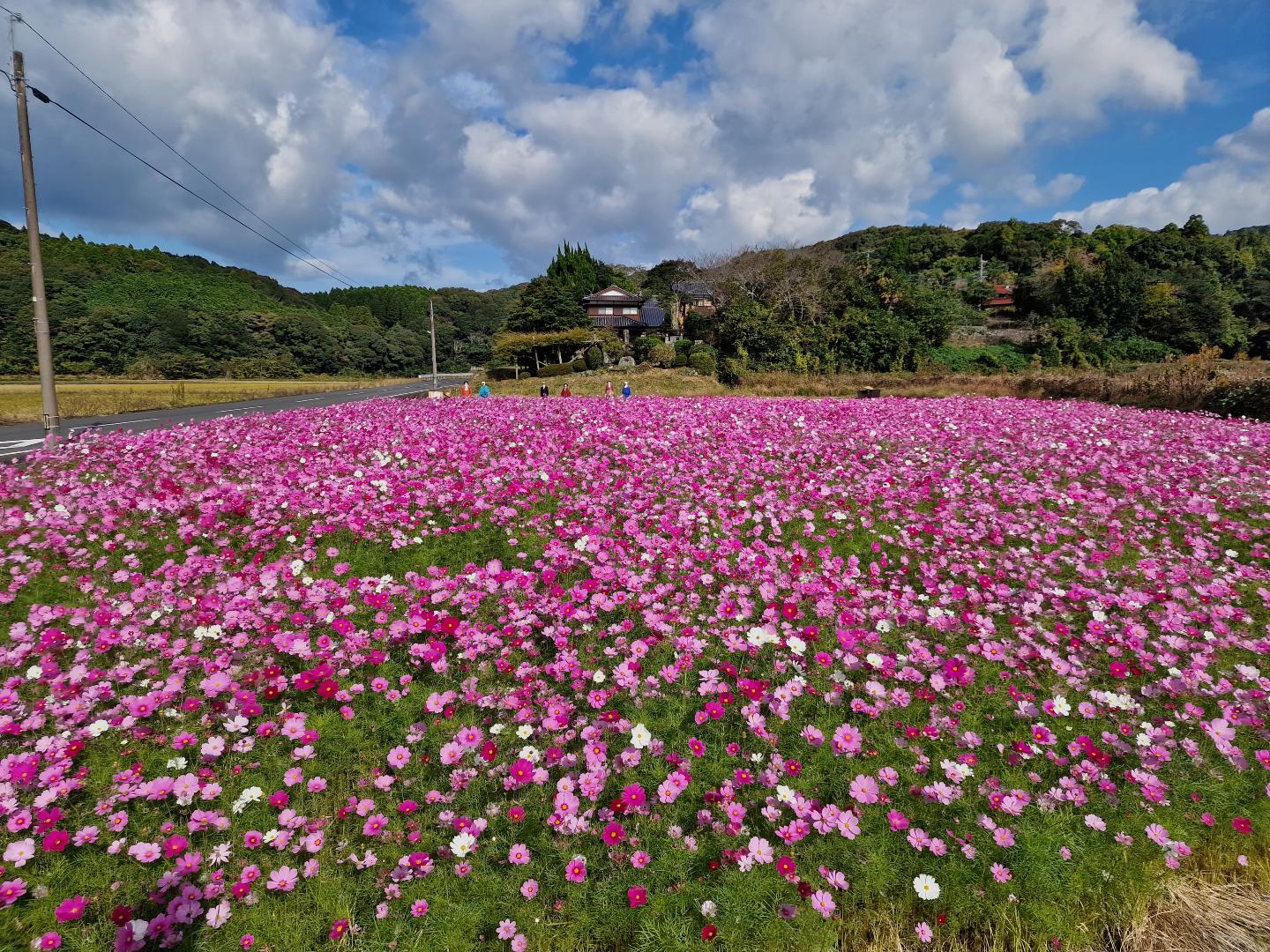 Karatsu, Saga Prefecture, Japan: Syklet forbi noen flotte blomsterenger med høstblomster.